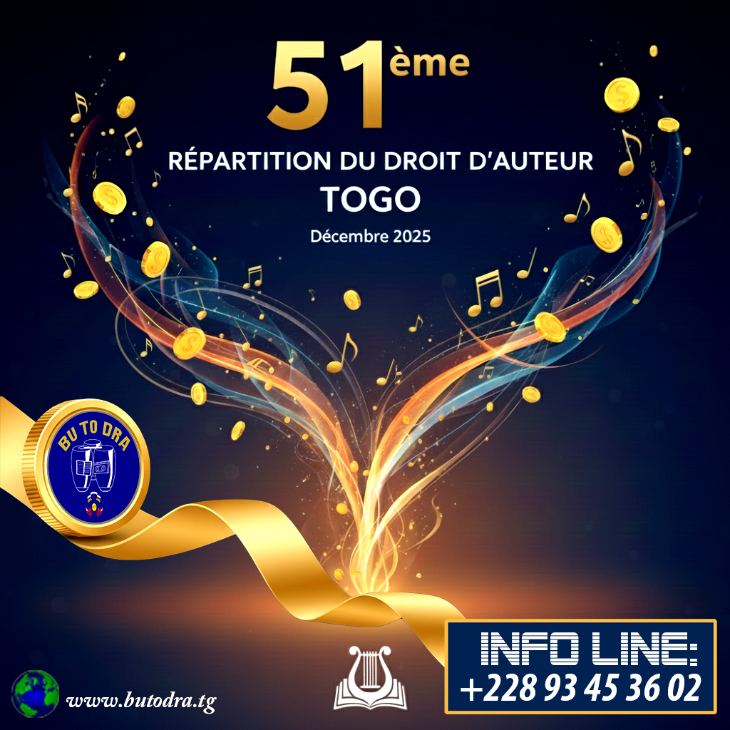 La Direction générale du BUTODRA informe les auteurs créateurs des œuvres de l’esprit que le paiement des droits d’auteur comptant pour la 51è répartition des droits pour le compte du second semestre 2025 dont la liste est jointe débutera ce vendredi 26 décembre 2025. Tous les paiements de cette répartition se feront par virement bancaire à la poste (CCP).